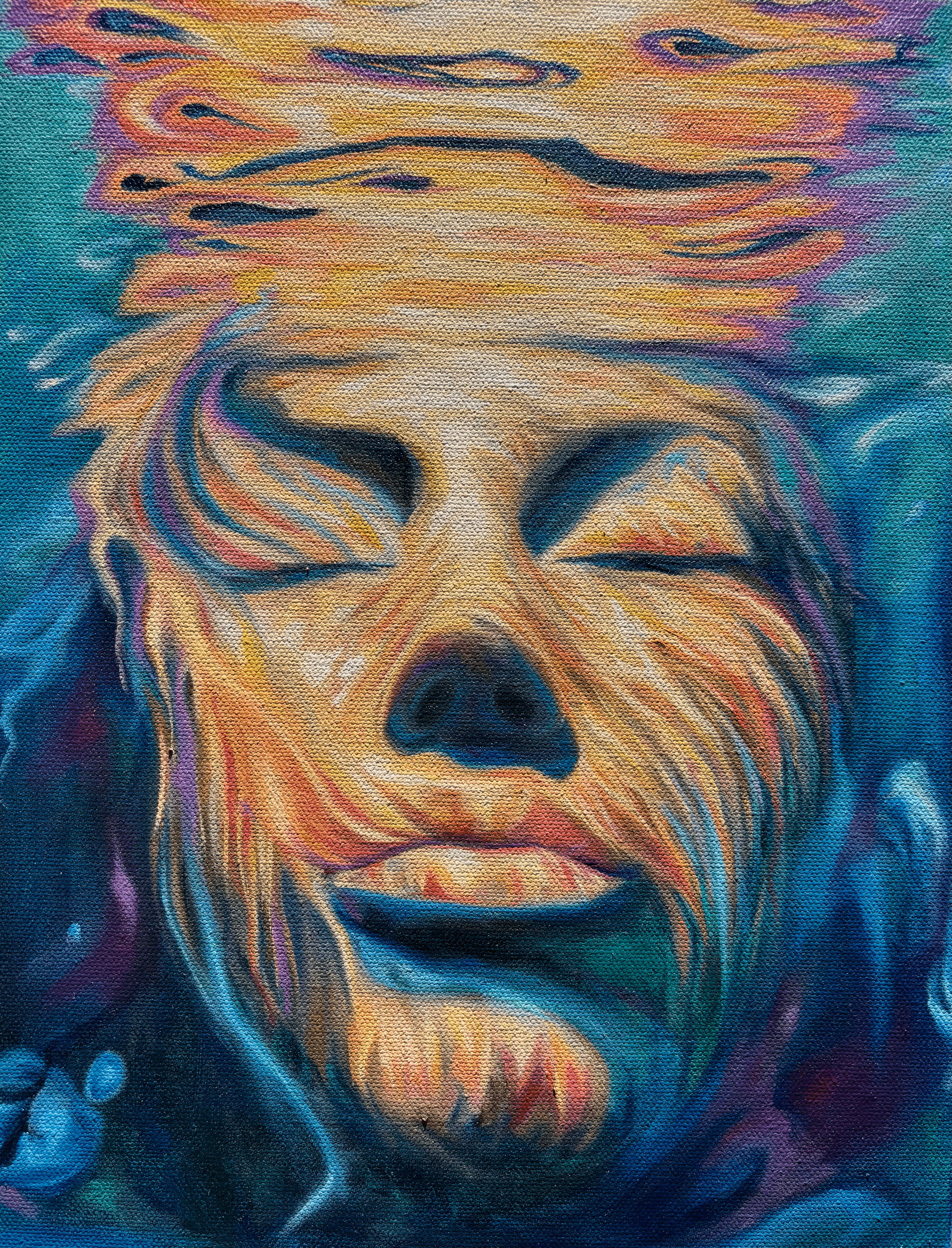 A surreal image of the face of one light up by a multitude of colors underwater. The surface is just above their head, a swirling momentum of energy and bold colors.